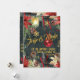En festlig, lyxig och elegant julfirande inbjudan med en mörkgrön skogsvinterbakgrund med glittriga gyllene snöflingor, akvarellmålade julstjärnor, kottar, röda bär med en varm lykta och ett skinande rött julgransprydnadsföremål på rött band som svävar i luften. Framsidan på inbjudan lyder: Jingle & Mingle, Hos Austin, Lördag 8 december, 20:00, medan baksidan har din adress och nödvändiga RSVP-uppgifter.