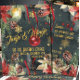 En festlig, lyxig och elegant inbjudan till julfirande med en mörkgrön vintermörk skog som bakgrund med glittriga gyllene snöflingor, akvarell-målade julstjärnor, kottar, röda bär med en varmt lysande lykta och ett skinande rött glasklot på röd slinga som svävar i luften. Framsidan på inbjudan lyder: Jingle & Mingle, Hos familjen Austin, Lördag 8 december, 20:00, medan baksidan har er adress och nödvändiga RSVP-uppgifter.