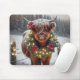 En hödeko står i ett snölandskap med en festiv krans som dekoreras med poinsettias och ljus