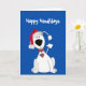 Vit hund grafik med en Jultomten-hatt på blå bakgrund. Bakgrunden till färg kan ändras. Text kan redigeras.