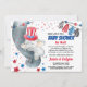 All text kan redigeras. Tema: 4 juli Independence day. Patriotiskt tema. Tillfälle: Babydusch per post, virtuell babydusch, avstånd länge Stil: söt, elegant boho. Färg: Röd, vit, blå. Bild: vattenfärgen baby elefant, Rött vitt blått konfetti, Patriotic Top hat.