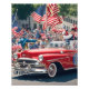 Utforma en bild med en vintage-inspirerad 4:e juli i parad med klassiska bilar, marschband och åskådare i reflexer.