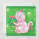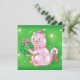 Vintage illustrerar julens helgdag med en söt rosa katt med en julhatt och en rosa i hatt med klockor. Det förtjusande kattdjuret i håriget håller en julkrans och har ett rött band hängande från sitt svan. Startar gnistra på gröntens bakgrund.