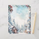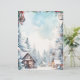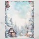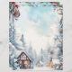 En vacker bild av en snöskog i bergstrakter och loggstugor. Gräns av julbär, dekoration och gräs. En underbar brevhuvud till skrivan för en speciell anteckning till familj eller vänner vid jul.
