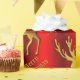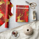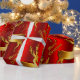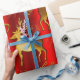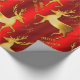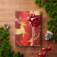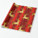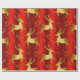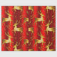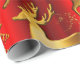 En mycket festlig och färglös röd julomslutning och guld papper med en mönster av guldrenar på en lysande, levande röd bakgrund. Runt om i renarna finns det små blommor av gyllene snö och den traditionella julen hälsning i God jul (även i guld).