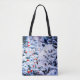Sparvar och en duva vid fågelbordet vintertid. Snötäckta julgranar dekorerade med röda, blå bollar runt omkring. Julidyll. Unik, superbt totebag. Du kan överföra denna design till en mängd andra produkter, välj bara en produkt från en rad nedan. Ha kul och var glad!