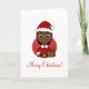 Julkort med en illustration av en söt leende afroamerikansk flicka med kort svart hår, flickan har en tomte kostym med röd hatt och håller en present; i en röd cirkel på vit bakgrund, med en redigerbar textmall för ditt meddelande