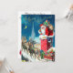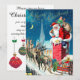 Vintage-illustrerad juldesign med en gammaldags tomte på taket som är på väg ner genom skorstenen. Renarna och släden väntar på taket. En vacker kyrka syns i bakgrunden med stjärnor och månen på den blå natthimlen.