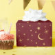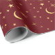 En himmelsk design med måne och stjärnor mot en julig mörkröd bakgrund, ett idealiskt presentpapper för julhögtiden.