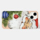 Vintageillustration God jul semesterkitschdesign med en glad jultomte med rosiga kinder, ett vitt fluffigt skägg och bärande en röd hatt. Han står bredvid ett dekorerat julgran med glaspynt. Ho, ho, ho, God Jul!