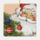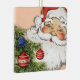Vintageillustration God jul-helg kitschdesign med en glad jultomte med rosiga kinder, ett vitt fluffigt skägg och en röd hatt. Han står bredvid ett dekorerat julgran med glasiska prydnader. Ho, ho, ho, God Jul!