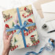 Retro julpapper med söta kattungar som bär gröna slingor och röda tomtehattar och åker nedför en backe på en sockerrörspinne