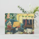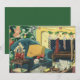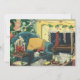 Gammal illustration Glad jul semesterscen med ett inre rum i ett hus. Ett vardagsrum med ett dekorerat julgran, julstrumpor som hänger vid öppen spis, ett mellanmål och ett brev kvar till tomten och familjens husdjur (en kattunge och en valp) som sover tillsammans på soffan och väntar på tomten.