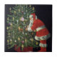 Vintageillustration God jul semesterdesign med en jolly jultomte som tänder ljus på en dekorerad julgran med inslagna gåvor och presenter under. Julhälsningar och God Jul!! Ho, ho, ho!