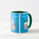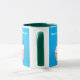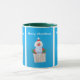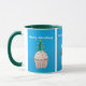 En festiv vit ringsignal mugg med en grumlig fälg med grönt och handtag och med ljusblå God jul i vitt, precis under fälgen. I varje panel finns en cupkaka, full av vit frost och holly, en Julgran med ljus och en stjärna och en Pappa jul!