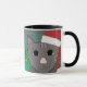 En roligt julkattdesign av det här lilla grått kattunge med en röd och vit julhatt. Två helgdag prydnadsföremål hängande från hans andra öra. En bakgrund för söt grönt.