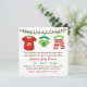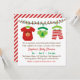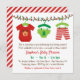 En inbjudan med söta barnkläder som hänger över den färgstarka julen ljus. I kläderna ingår en rödnosad renare baby, en grönt baby med Julgran och ett par rött och vitt stripigt byxor. Anpassa enkelt med dina party-detaljer. Perfekt till babyduschar på vintern, julhelgen i december!