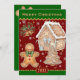 Julkokning/Baking Card med pepparkaksgubbe av vintage tillsammans med hus och Julgran som tillverkats av brödbröd och snöflingor som faller runt. Byt enkelt nytt år och helgdag till dig personlig-familjekort.