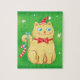 Vintagen illustrerar julens helgdag med en söt orange katt som bär en julhatt och röd båge. Det här berömvärda kattdjuret i håriget har ett underbart stort Cheshire Cat-leende och ett candy cane hängde från hennes svan. Startar gnistra på gröntens bakgrund.