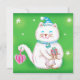 Vintagen illustrerar julens helgdag med en söt vit katt som bär en julhatt och blå klocka. Detta förtjusande kattdjur i håriget håller ett Julklapp och har ett hårt hjärta hängande från sitt svan. Startar gnistra på gröntens bakgrund.