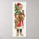 Vintageillustration Viktoriansk julbild med en gammaldags tomte som bär på julklappar och en julgran. Ursprungligen från en viktoriansk utklippsbild.