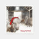Kute vattenfärg Hereford-kon med en Jultomten-hatt i en lada med tupp och stege. Text kan redigeras.