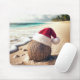 En kokosnöt med en jultomtehatt vilar på en solig strand med mjukt vågar i bakgrunden