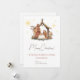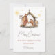 Nativitetshögkort med söt modern bild av nativitetsscenen. Anpassa all text. En modern illustration av baby Jesus i manger, Mary och Joseph tittar på honom, omgiven av nyfikna ladudjur. Lämpligt för alla, från barn till medarbetare.