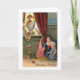 Visning för klassikervintagejulkort två barn som gömmer bak en Sanktt Nicolas för gardin som och för hålla ögonen på tömmer en säck av leksaker och gåvor till och med fönstret.