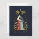 Det här julkortet har en illustration av den heliga familjen omgiven av ett par palmer, Betlehemsstjärnan och vita liljor. Denna intima design fångar miraklet och intimiteten i Jesu födelse.