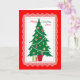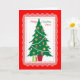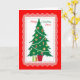 Julkort för mamma med en grönt som dekorerat Julgran och presenter, faux snöre som gräns, på röd och vit bakgrund. Tack vare Kreativet Fabrica för en del av inslag i designen.