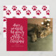 Denna katters älskares juldesign har frasen "Have yourself a meowy little Christmas" i ett modernt vitt skrivstil med små vita tassavtryck runt omkring och ett rött och vitt tassavtrycksmönster på baksidan.