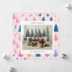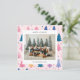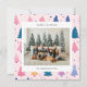 Julkort med söta illustrationer av julgranar i en pastellfärgspalet med ett familjefoto i par med en högtidlig hälsning och ditt namn och år i en sans-serif-teckensnitt.