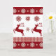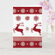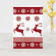 Denna klassiska anpassningsbara helgdesign har två silhuetter av renar i röd färg, röda rutmönsterdetaljer som löper över kortets bredd och röda snöflingor på vit bakgrund.