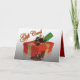Julkortet för röd gåva för pengar boxas med dekoration, plädprydnadar och den gröna gåvamärkren. Avbilda och illustrationsammansättning. Pengarhållare med gullig dikt.