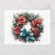 Ett vykort med en vacker julkrans. En festlig bild med en tallkrans dekorerad med röda blommor, järnek och ett vackert blått band. Härlig.