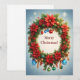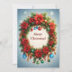 Ljus och glädjefull julkrans prydd med livfulla julstjärnor, glittrande dekorationer, snöflingor och band på en varm mjuk bakgrund som symboliserar glädje och firande under högtiden.