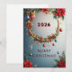 Ljus och glad julkrans prydd med livfulla julstjärnor, glittrande dekorationer, snöflingor och band på en varm mjuk bakgrund som symboliserar julglädje och firande.