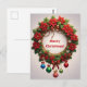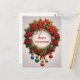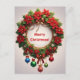 Ljus och glad julkrans prydd med livfulla julstjärnor, glittrande dekorationer, snöflingor och band på en varm mjuk bakgrund som symboliserar glädje och firande under högtiden.
