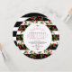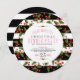Elegant jultomteillustration med grönt evergreens och jultomrött bär över modernt svart och vitt rand. Vit cirkel i centrum för anpassadets inbjudan till julmätarfest.