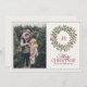 Elegant-helgdag-fotokort med en julkrans med anpassade monogram i mitten och det klassiska röda manuset "God jul". Baksidan innehåller utrymme för semesterhälsningar - du kan behålla standardmeddelandet, skriva ditt eget eller ta bort det helt och hållet för att få en minimalistisk framtagning. Ett tidlöst sätt att värma julen i önskemål med familj och vänner.