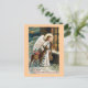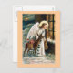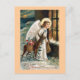 Mycket sött julkort som visar en ängel tittar i ett husfönster. Hon har en aning kränkt vid sin sida som bär basket i leksak.