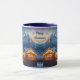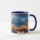 Mugg har en djup snöby i bergen på kvällen. Folk går tjockt klädda över den festligt tända julmarknaden. Ett romantiskt motiv för alla som kärlek jul! Söt, anpassningsbar liten julklapp till vem som helst!
