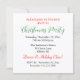 God jul i party. Du är inbjuden i svart skript. Säsongens Hälsning-typografi i vitt mot grönt och röd geometrisk rektangel. Festive evergreen gräs nål boughs with gräs cones and red bow, guld bell and red bär on wood log. Baksidan innehåller detaljer om party i svart typografi och röd och grönt skript. Originalfotodesign av TamiraZDesigns.