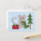 En söt scen med en helgdag med en grönt som lagrar fullt ost. En Julgran och en röd inlindad gåva. En ljusblå bakgrund där vitt snöflingor faller.