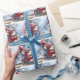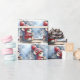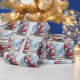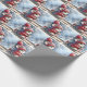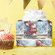 En mysigt mus i en röd tröja och som sitter i ett frostigt fönster som håller kopp i hett kakao samtidigt som man beundrar ett snölandskap med gräs träd och snöflingor