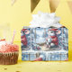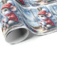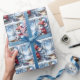 En mysigt mus i en röd tröja och som sitter i ett frostigt fönster som håller kopp i hett kakao samtidigt som man beundrar ett snölandskap med gräs träd och snöflingor