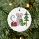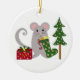 En söt scen med en liten julmus som håller en grönt i lager fylld med ost. En röd gåva och en Julgran accent på scenen.