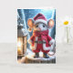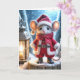 En söt mus iklädd en tomte-dräkt står på en snöig stubbe bredvid en lysande lykta