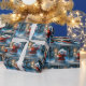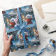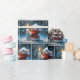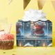 En liten mus med röd vinter jackar ett ljus omgivet av mjukt fallande snöflingor